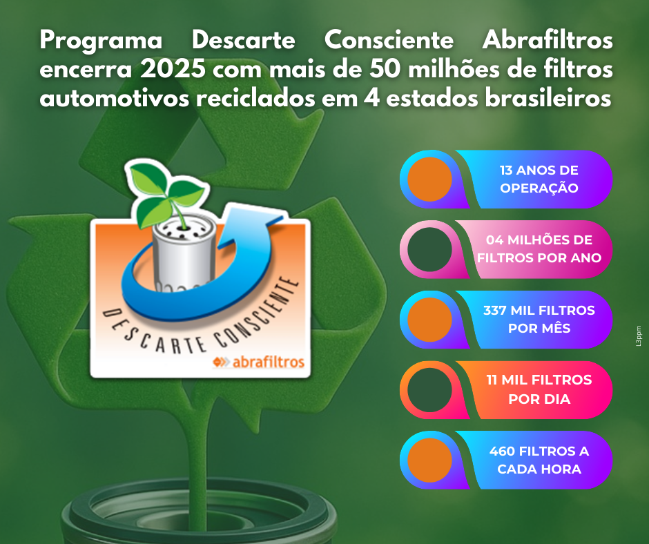 O programa Descarte Consciente Abrafiltros, de logística reversa de filtros usados do óleo lubrificante automotivo, desenvolvido pela ABRAFILTROS – Associação Brasileira das Empresas de Filtros Automotivos, Industriais e para Estações de Tratamento de Água, Efluentes e Reúso, é um exemplo de modelo bem-sucedido que só avança pelo país, contribuindo para o desenvolvimento sustentável do setor automotivo. Implantado atualmente em quatro estados – São Paulo, Paraná, Espírito Santo e Mato Grosso do Sul, o programa já reciclou 52.552.835 filtros até novembro de 2025.